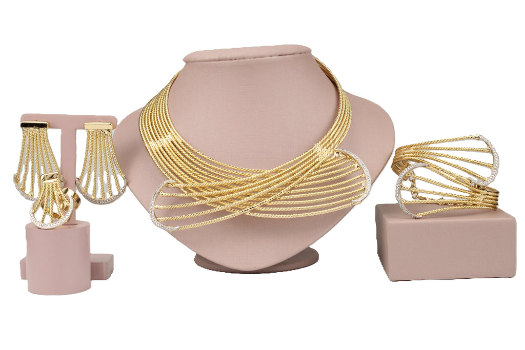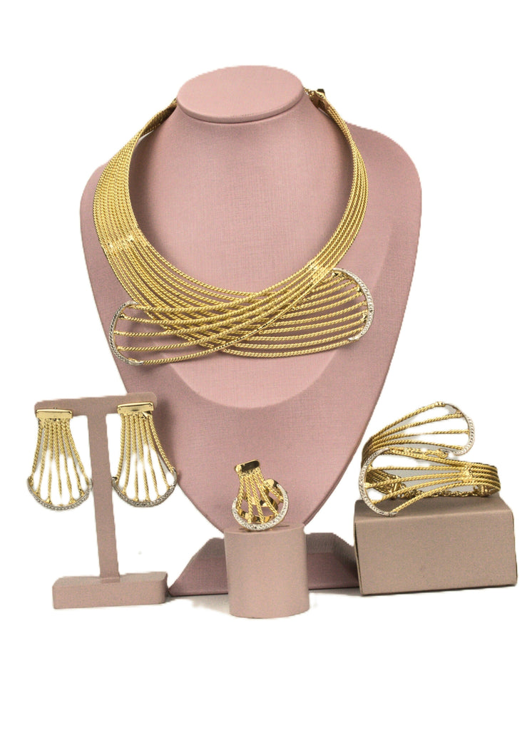 Make a glamorous statement this 18ct Brazilian yellow gold layered necklace set. This exquisite accessory features a multi-layered intertwist design, beautifully overlaid and adorned with crystal-clear gemstones for a stunning and flawless finish, perfect for special occasions. This sophisticated piece, paired with its captivating earrings, is a true testament to elegance and grace. Moderately polished for a refined and elegant appearance. It is ideal for Mother's Day, Mother of the Bride, engagements, weddings, birthdays, or as a perfect gift. This timeless set includes one necklace, a pair of earrings, a bangle, and a ring.