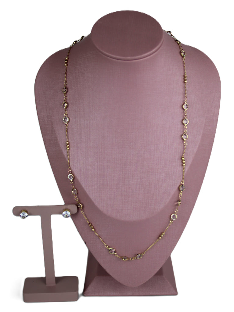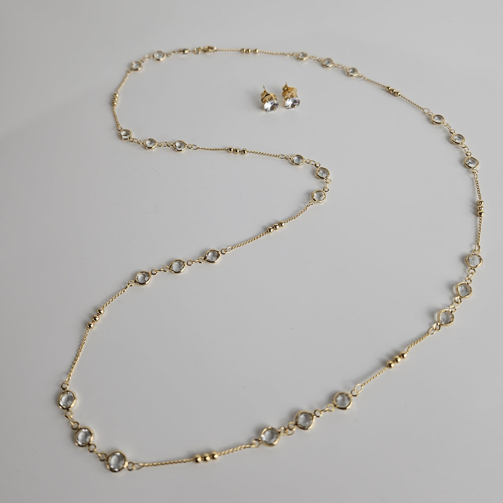 Simple and Elegant 18ct Brazilian Gold Gemstone Necklace Set. This beautiful set is crafted with Rolo chain embellished with ray of crystal clear gemstones for a great accent. Highly polished to give a stunning perfect finish and ideal for day or evening wear. This intrigued piece with its stud earrings will add glamour to your day. A timeless set comprises one necklace and a pair of earrings.