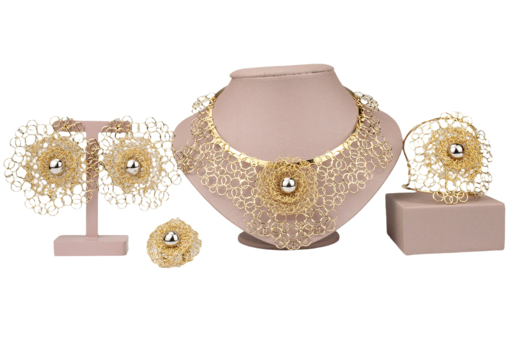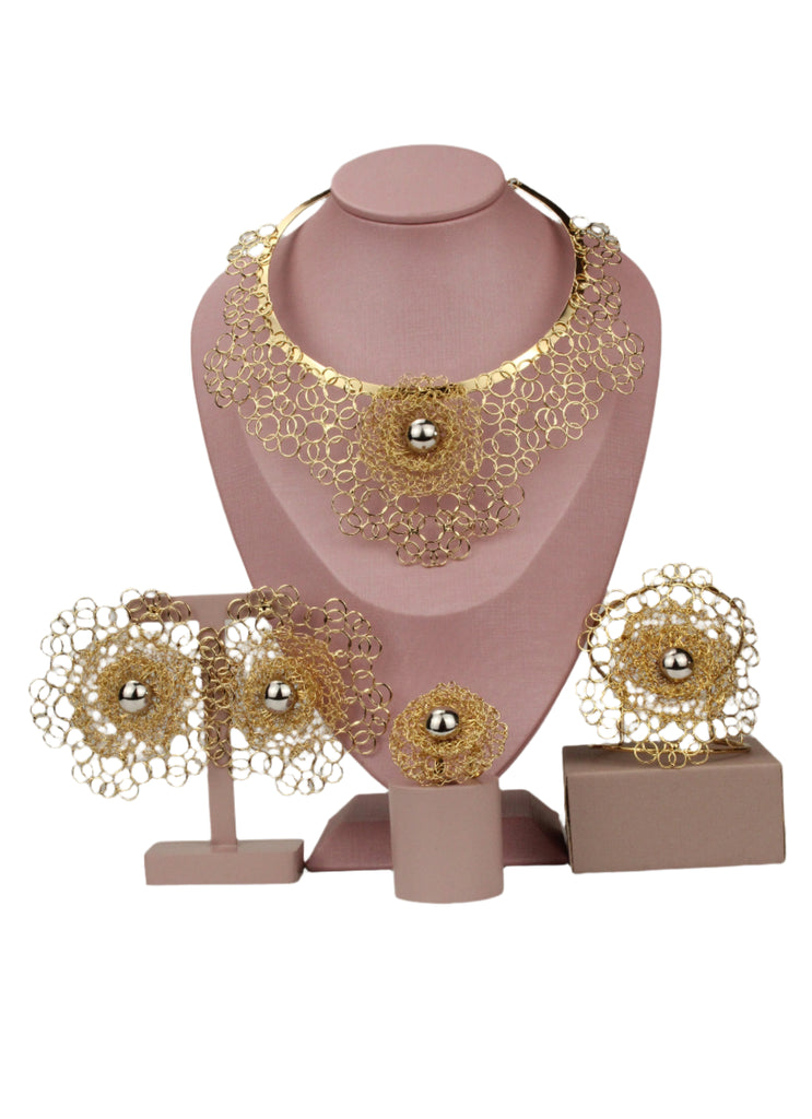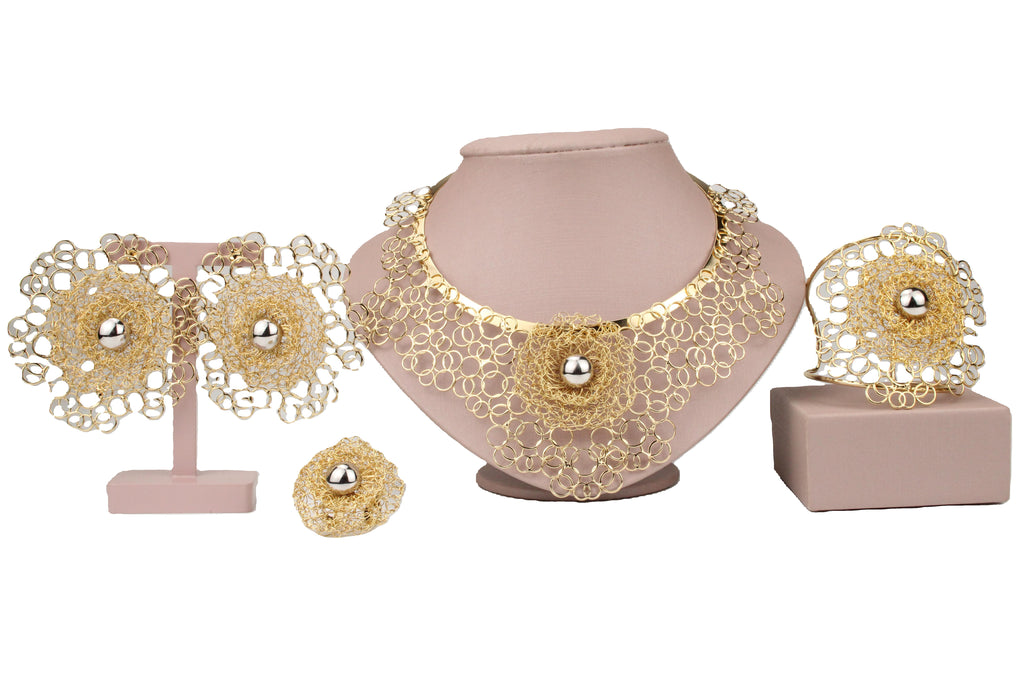 Make a statement with this exquisite 18ct Brazilian yellow gold Cleopatra necklace set. This exclusive piece features a beautifully sculpted array of rings, adorned with mesh embellished with silver balls for an elegant touch. Expertly polished to perfection, it is the ideal choice for special moments. Accompanied by intricately matching earrings, this captivating set embodies timeless. Perfect for occasions such as Mother’s Day, mother of the bride, weddings engagements, birthdays, or as a thoughtful gift for her. This timeless collection includes a necklace, a pair of earrings, a bangle, and a ring