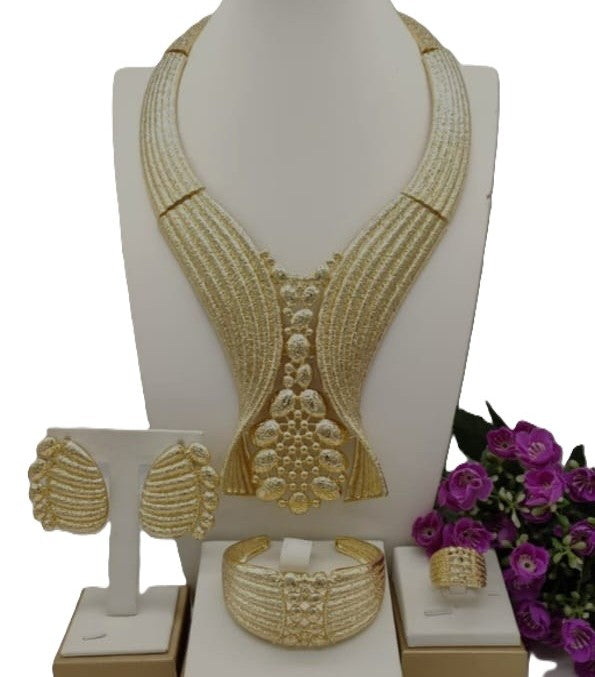 This Spectacular Italian Gold Replica hinge necklace set showcases a beautiful rough-textured twin wave design accented with semi balls for a chic look. Made from high-quality alloy and copper, it is moderately polished, free of nickel and lead, hypoallergenic, and durable. The set includes a necklace, earrings, a ring, and a bangle, making it perfect for any occasion. It’s an excellent gift choice for Mother's Day, birthdays, weddings, engagements, bridesmaids, the mother of the bride, or simply as a heartfelt present for someone special.