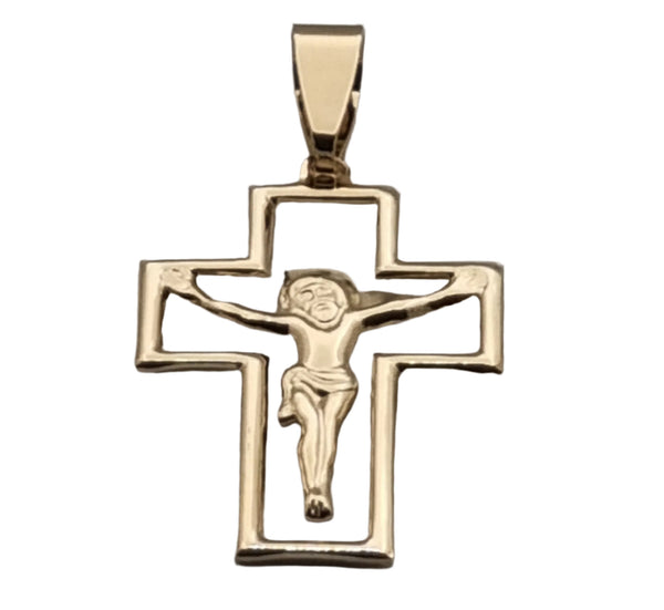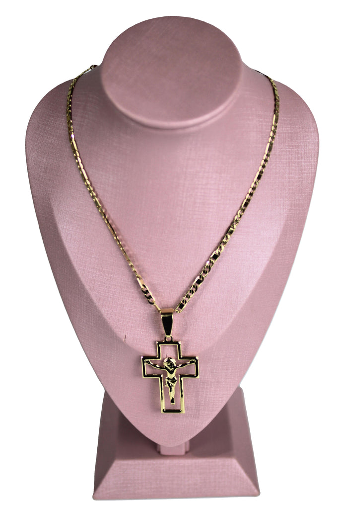 18ct Brazilian Gold-Filled 19-Inch Chain and Crucifix Set. This elegant piece features anchor chain and an exquisite engraved crucifix, offering a sophisticated accent. This piece is meticulously polished to achieve a flawless and stunning finish, making it ideal for both daytime and evening wear. Suitable for adults and children aged 12 and above. The crucifix can be interchanged to suit your preference.