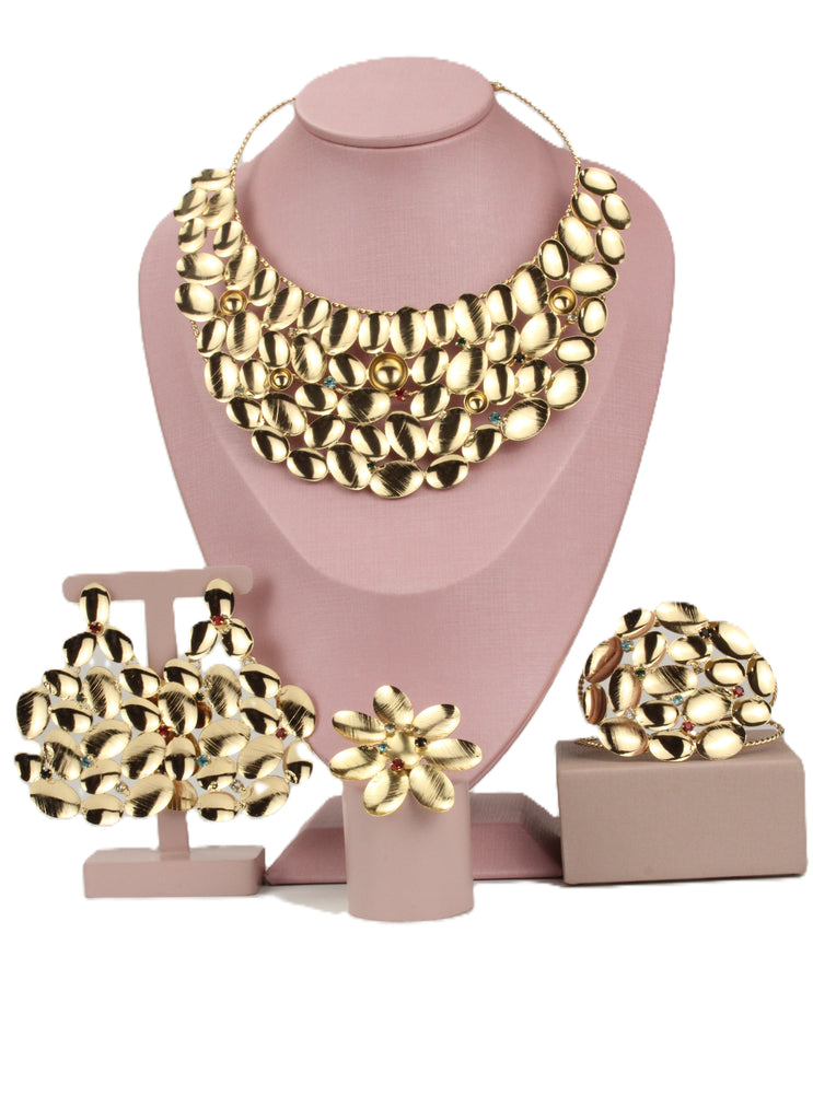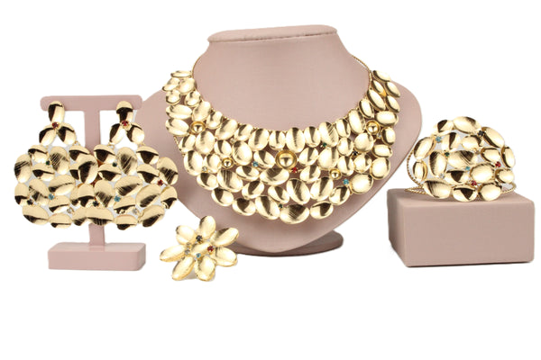 Make a glamorous statement with this 18ct Brazilian yellow gold necklace set. This exquisite accessory features a smooth, textured bean design, beautifully adorned with multi-coloured gemstones for a flawless and stunning finish, perfect for special occasions. Accompanied by its captivating earrings, this sophisticated piece exudes elegance and grace. Highly polished for a refined and elegant appearance. It is ideal for Mother's Day, Mother of the Bride, engagements, weddings, birthdays, or as a perfect gift. This timeless set includes one necklace a pair of earrings, a bangle, and a ring.