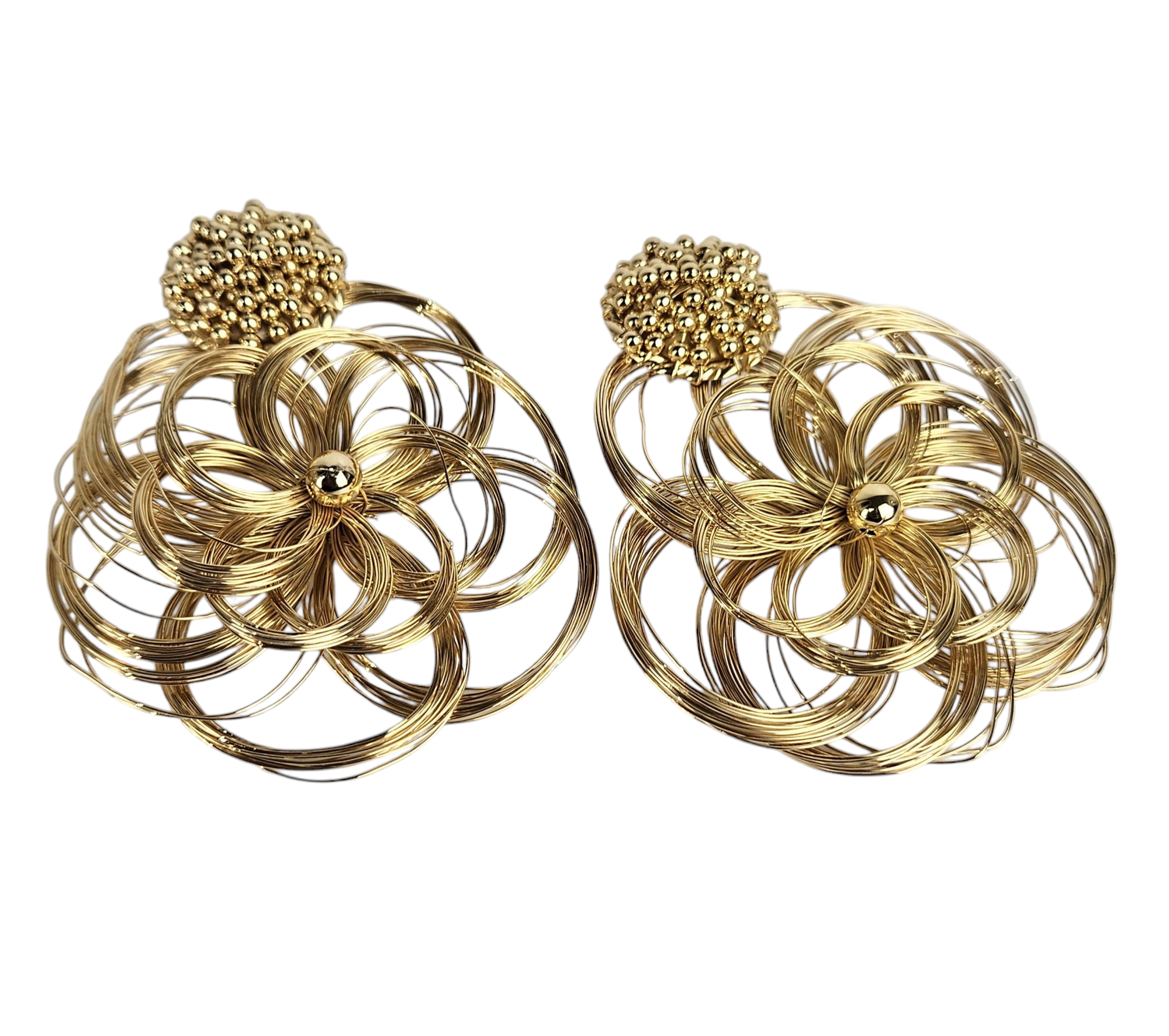 Elegant 18ct Brazilian gold-filled earrings. These stunning pieces showcase intricate layered wirework, beautifully enhanced by a miniature ball upper and adorned with a ball for a flawless, captivating design. This refined accessory is perfect for any occasion featuring a highly polished finish suitable for both daytime and evening wear.